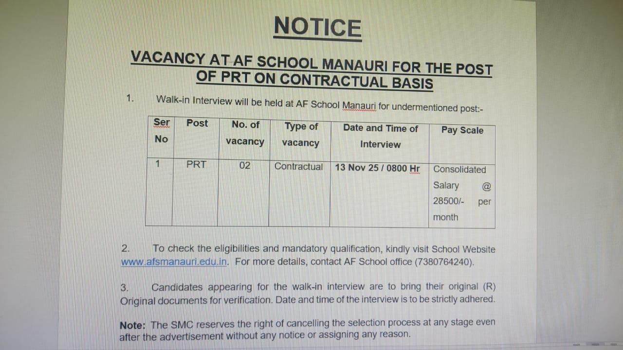 WALK -IN INTERVIEW WILL BE HELD AT AF SCHOOL MANAURI FOR 02 PRIMARY TEACHER (PRT) POST ON CONTRACTUAL BASIS. CANDIDATES APPEARING FOR THE WALK IN INTERVIEW ARE TO BRING THEIR ORIGINAL DOCUMENTS FOR VERIFICATION.